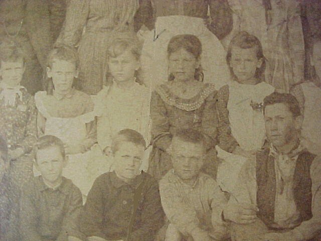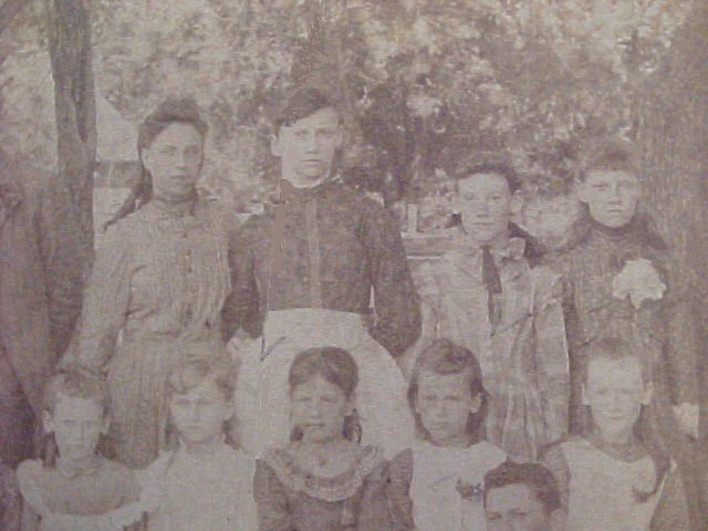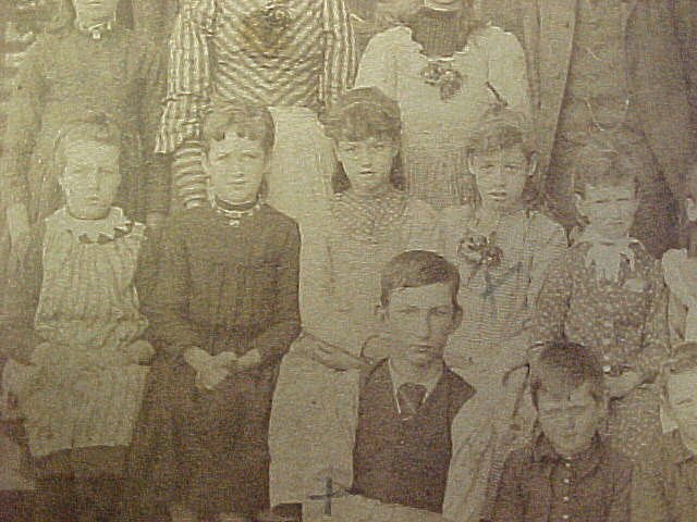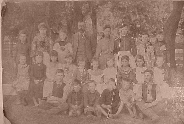 From upper left (as given on the back of the original photo) are: Alice Haney, Bessie Furr, Tira McPherren, teacher Travis Wright, Emma Cowan, Jessie Park, Austia Park, Carrie Stephens; (middle row) Eulalia Park, Myra Park, Floy McPherren, Olive Werts, Nira Park (myra's twin), Grace McCreight, Lena Furr, Winnie McPherren, Anna Haney, Kate Haney; (bottom) Lee Werts, Scott Stephens, Frank Werts, Earl Stephens, Westley Caldwell, Alonzo Werts